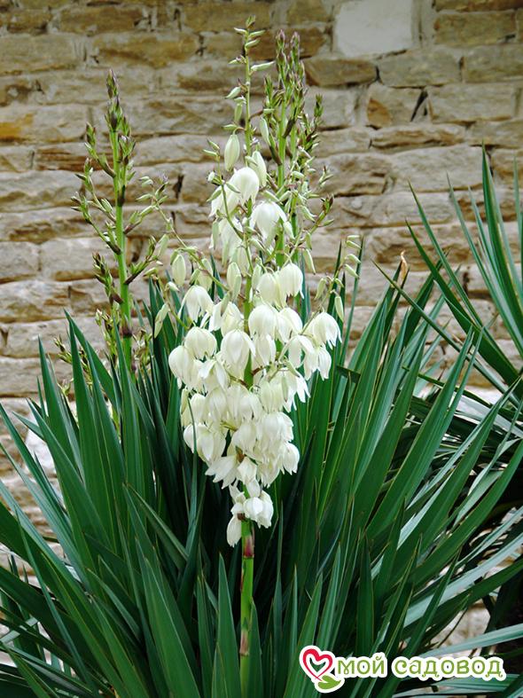 Это карликовый вечнозеленый многолетник, который цветет с конца июня по август. На поверхности грунта он формирует крупную розетку листьев. Листовые пластинки узкие и длинные (около 45 см). Окрашены они в сине-зеленый цвет. По краям проходит ярко-желтая кайма. Иногда она с примесью розово-малинового цвета. Цветки кремово-белые, колокольчатые, диаметром до 8 см. Как правило они собраны в высокие и пышные соцветия длиной 1 м. Плод – округлая коробочка шириной до 5 см. Корневая система хорошо развитая.